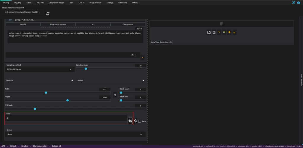 Je vous conseille de réinitialiser le champs ‘Seed’ pour générer une autre image que celle de CivitAI en cliquant sur le bouton qui a une icone de dés.