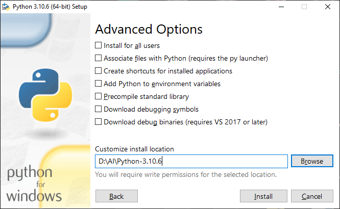 Décochez tout et remplissez ‘D:\AI\Python-3.10.6’ comme chemin d’installation :