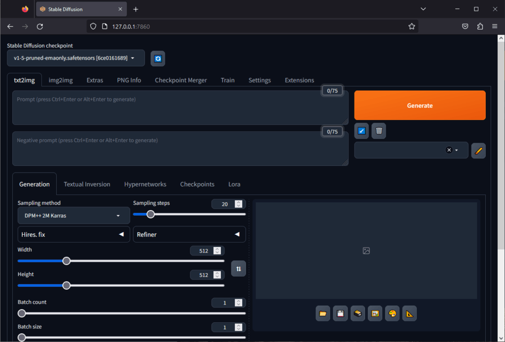 Une invite de commandes va s’ouvrir et installer des modules Python pour Stable Diffusion. Cela peut prendre un peu de temps (plusieurs minutes) mais vous devriez avoir une page web à s’ouvrir ou bout d’un certains temps (mais ne fermez pas l’invite de commandes tant que vous êtes sur le site web).