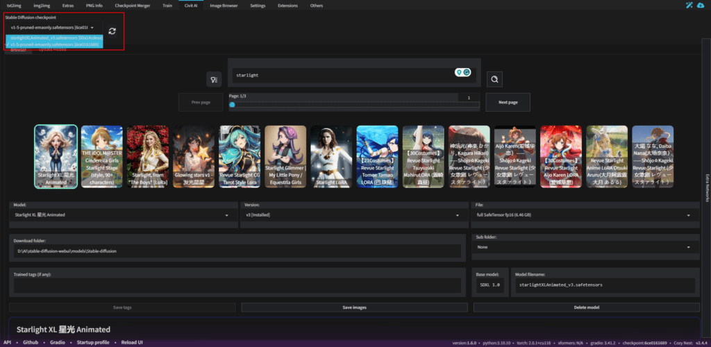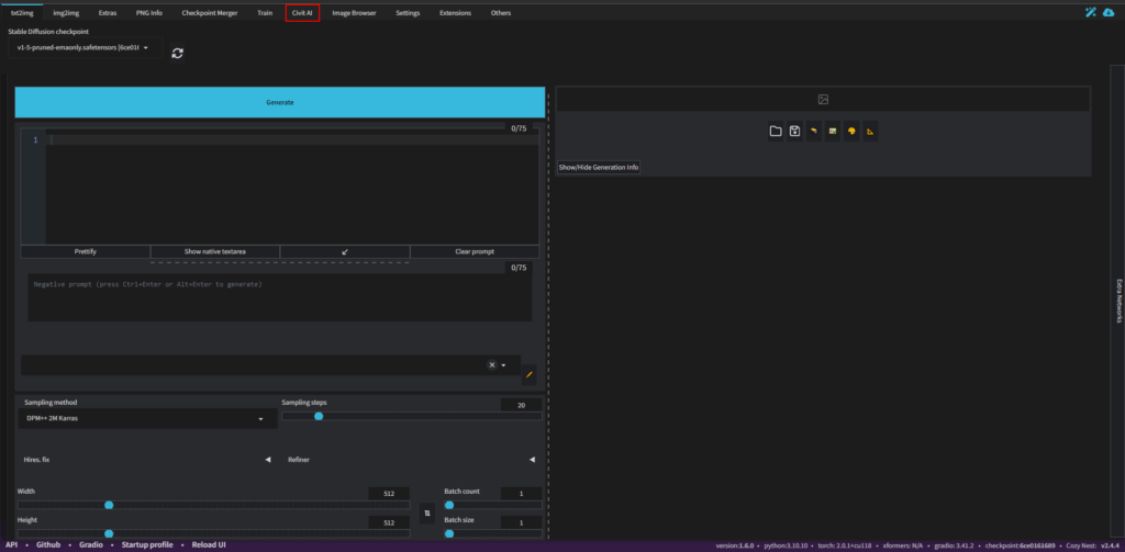 Vous pouvez lancer Stable Diffusion si ce n’est pas fait. Si vous avez installé l’extension CivitAI, vous avez l’onglet correspondant que vous pouvez cliquer. Je vous conseille de passer par cette extension comme ça vous n’avez pas à savoir ou mettre le modèle sur votre installation (en fonction que c’est un Checkpoint, Lora, etc), tout est fait à votre place.